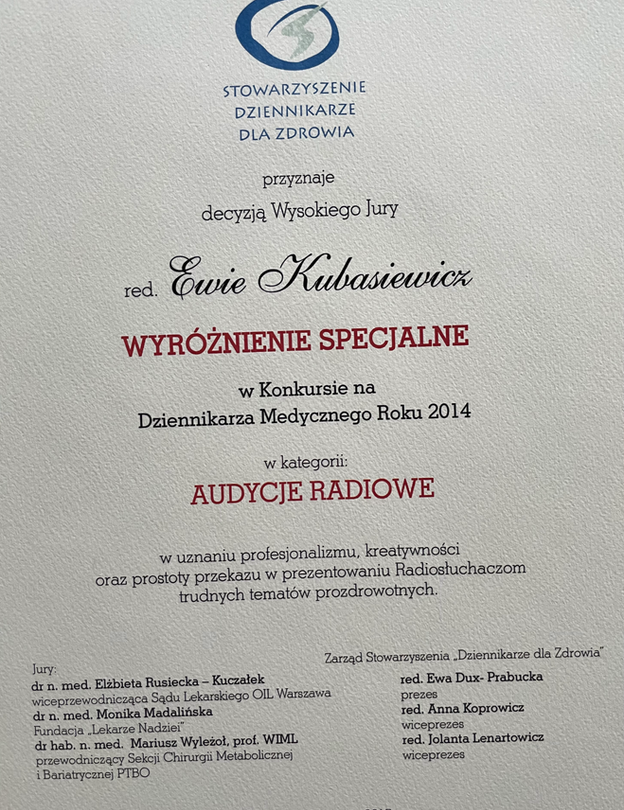 Redaktor naczelna Radia Parada Ewa Kubasiewicz zdobywa nagrody i wyróżnienia w ogólnopolskim, prestiżowym konkursie Dziennikarz Medyczny